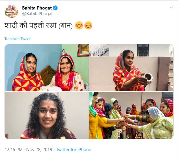 New Delhi [India], Nov 28 : Wrestler and BJP member Babita Phogat, who is all set to tie the knot with her fiance Vivek Suhag, started performing marriage rituals...