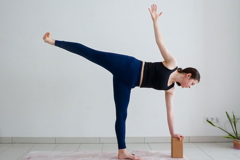• For extra support, place a beginner’s yoga block under your right hand.