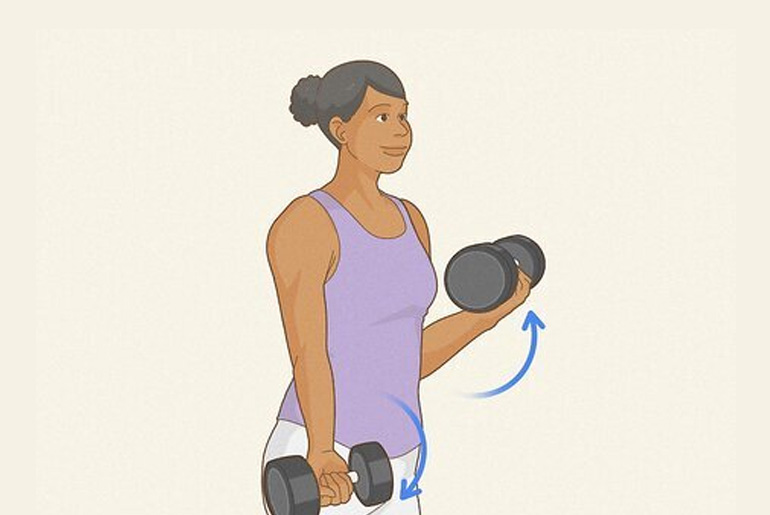Stand upright and with your feet shoulder-width apart. Now hold dumbbells in both hands and lift your shoulders back to activate your core. Bend solely at the elbows to curl the weight up, then slowly return the weights to their initial position. Continue until you reach the required number of reps.