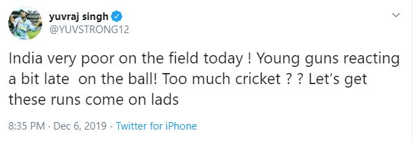 Hyderabad (Telangana) [India], Dec 6 : Former all-rounder stalwart Yuvraj Singh criticised India's fielding effort against West Indies in the ongoing first T20I of...