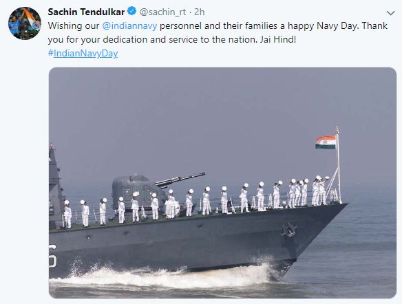 New Delhi [India], Dec 4 : Sachin Tendulkar on Wednesday extended his wishes to Indian Navy personnel on the occasion of Navy Day and thanked them for their...