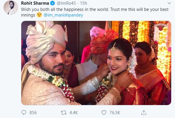 New Delhi [India], Dec 3 : India skipper Virat Kohli on Tuesday congratulated team-mate Manish Pandey on getting hitched."Congratulations Pandey Ji. Wish you both a...