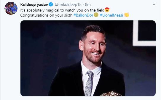 New Delhi [India], Dec 3 : Indian spinner Kuldeep Yadav on Tuesday congratulated Barcelona striker Lionel Messi on winning the record sixth Ballon d'Or award."It's...