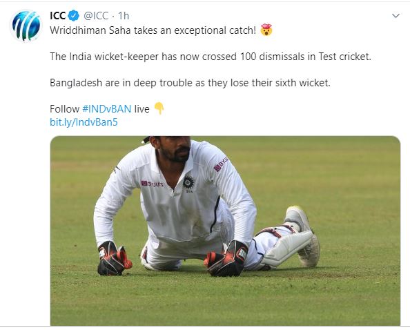 Kolkata (West Bengal) [India], Nov 22 : Wriddhiman Saha on Friday became the fifth Indian wicket-keeper to affect 100 dismissals in the longest format of the...