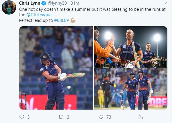 New Delhi [India], Nov 19 : After playing a knock of 91 runs in the T10 League match, Australia batsman Chris Lynn on Tuesday said that being among the runs in the...