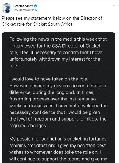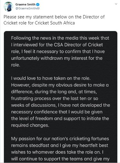 New Delhi [India], Nov 15 : Former South Africa skipper Graeme Smith has withdrawn his name from contention for the post of Cricket South Africa's (CSA) Director of...
