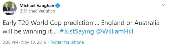 New Delhi [India], Nov 10 : Former England skipper Michael Vaughan on Sunday gave his prediction as to who will be winning the next year's T20 World Cup slated to...