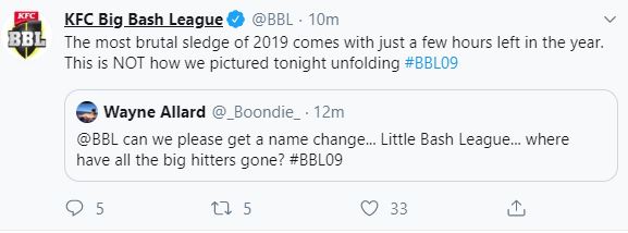 Adelaide [Australia], Dec 31 : Frustrated with the lack of big-hitting, a fan on Tuesday trolled Australia's T20 competition Big Bash League (BBL) and this prompted...