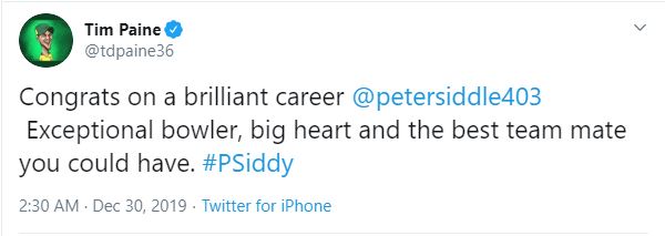 New Delhi [India], Dec 30 : Australia batsmen Steve Smith and David Warner on Monday congratulated his teammate Peter Siddle for an outstanding cricketing...