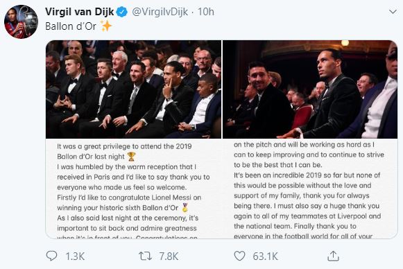 New Delhi [India], Dec 4 : After missing out on the Ballon d'Or, Liverpool defender Virgil van Dijk released a statement saying that it was an honour for him to be...