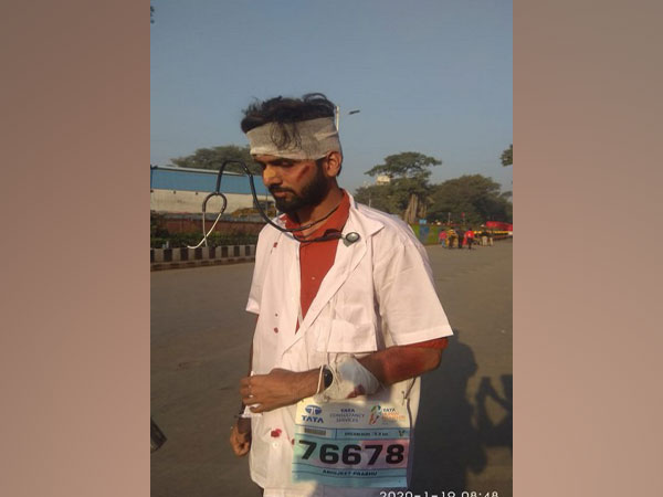 Mumbai (Maharashtra) [India], Jan 19 : Raising the issue of violence against doctors, a participant in the 17th edition of the Tata Mumbai Marathon came dressed up as a...