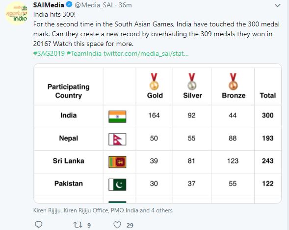 Kathmandu [Nepal], Dec 10 : India took its medal tally to 300 by Tuesday afternoon in the ongoing South Asian Games 2019.Out of these 300, 164 are gold, 92 silver...