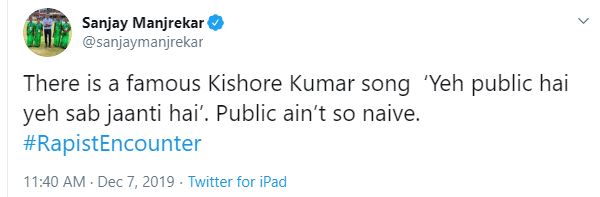 New Delhi [India], Dec 7 : Former India cricketer Sanjay Manjrekar on Saturday came up with a cryptic tweet regarding the encounter of the four accused in the...