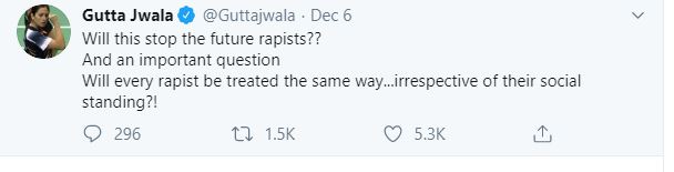 New Delhi [India], Dec 7 : Shuttler Jwala Gutta on Saturday said that she was really disturbed to see so many people celebrating the encounter of the four accused...