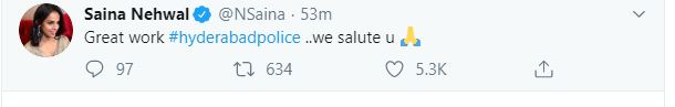 New Delhi [India], Dec 6 : Shuttler Saina Nehwal on Friday lauded Hyderabad police for killing all four accused in the rape and murder of a veterinarian in...