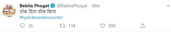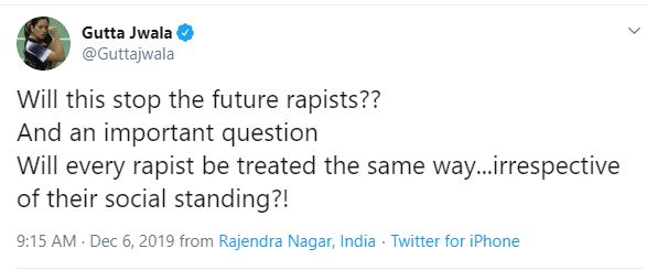 New Delhi [India], Dec 6 : After the four men accused in the gang-rape and murder of a young veterinarian in Telangana were shot dead by police on Friday, wrestler...